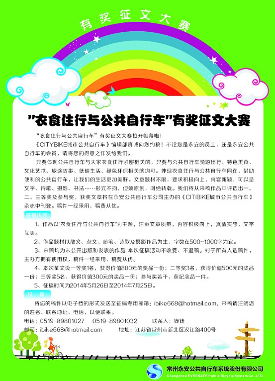 只要體現(xiàn)公共自行車與大家衣食住行緊密相關的,只要與公共自行車騎游出行、特色美食、文化藝術、旅途故事、低碳生活、綠色環(huán)保相關的均可。體現(xiàn)衣食住行與公共自行車同在,借助便利的公共自行車,讓我們的生活更加美好。文章題材不限,要求積極向上,內容新穎,可以是文字、詩歌、攝影、書法……形式不拘,但須原創(chuàng),謝絕轉載。我們將從來稿作品中評選出一、二、三等獎及參與獎,獲獎文章將在永安公共自行車公司主辦的《citibike城市公共自行車》雜志中刊登。稿件一經采用,稿費從優(yōu)。