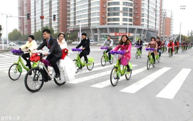 用公共自行車代替?zhèn)鹘y(tǒng)婚車,沒(méi)有豪車,沒(méi)有奢華的場(chǎng)面,但親友團(tuán)們組成的自行車陣,也賺足了市民的眼球,贏得百分百的回頭率。在高檔婚車“熱”的當(dāng)下,低碳、環(huán)保的公共自行車迎親隊(duì)伍猶如雨后一抹新綠,讓人眼前一亮。這種浪漫的結(jié)婚方式讓婚禮變得更有意義。