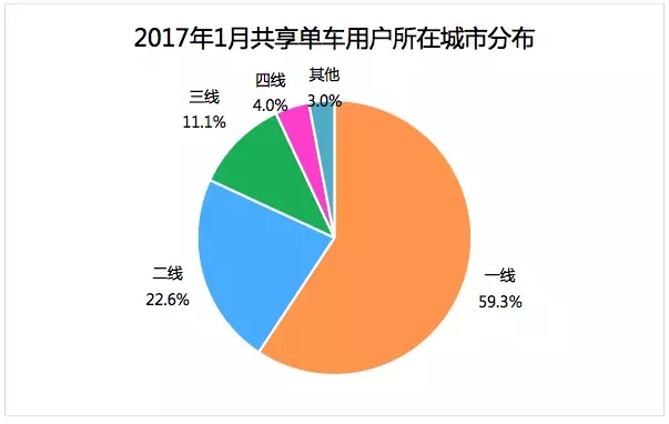 2017年1月共享單車用戶所在城市分布方便, 用戶多集中在一線城市中,一線城市占59.3%;二線城市占22.6%;三線城市占11.1%。