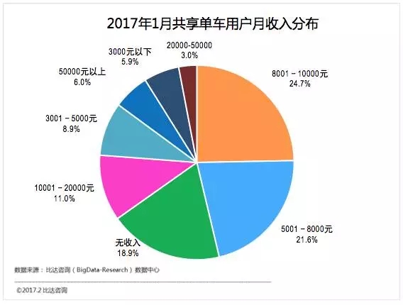 2017年1月共享單車用戶月收入分布方面, 8001元至10000萬占比最多,達24.7%;5001至8000元占21.6%;無收入人群多為學生群體,占18.9%。