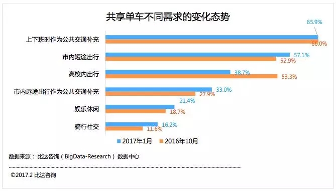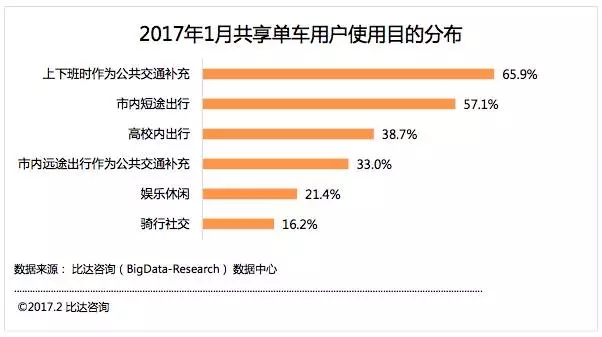 2017年1月共享單車用戶使用目的分布,上下班通勤作為交通補充最多,達65.9%;市內短途出行為57.1%;高校內出行38.7%。
