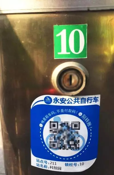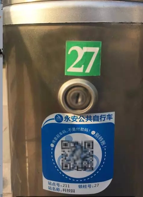 5、路人君在距離自己最近的一個站點上,發(fā)現(xiàn)每一個停車樁上都貼上了一個二維碼。