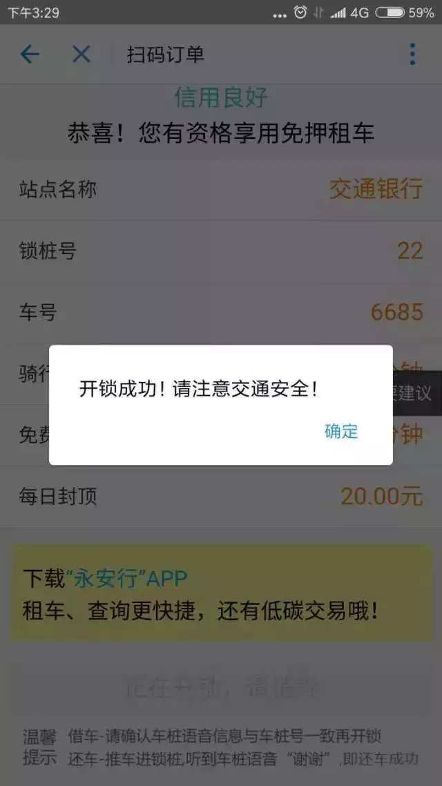 9、填寫好支付密碼后,跳轉(zhuǎn)的界面上,我們可以看到上面有站點名稱、鎖樁號、車號、騎行單價、免費時段以及每日封頂。