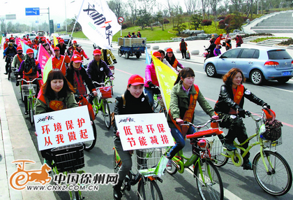 中國(guó)徐州網(wǎng)-彭城晚報(bào)訊 (記者 張傳寶) 昨日上午9點(diǎn)半,百余名文明閃客騎著自行車,匯聚到云龍山西門,上午10點(diǎn),閃客們臉上貼著文明閃客logo,舉著精心制作的環(huán)保標(biāo)語(yǔ),環(huán)湖騎行宣傳環(huán)保拉開了帷幕。